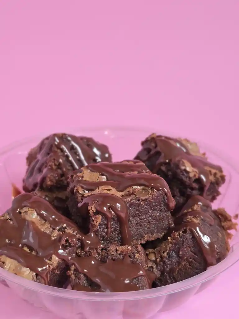 8 brownies deliciosos realizados con chocolate semiamargo bañados en ganache de chocolate semiamargo, de 3x3 cm cada uno aproximadamente.