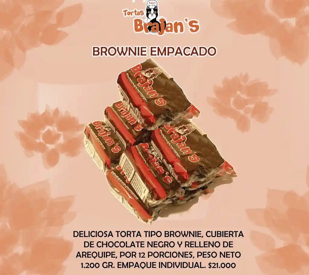 Deliciosa torta tipo brownie, cubierta de chocolate negro y relleno de arequipe, por 12 porciones, peso neto 1.200 gr, en empaque individual.