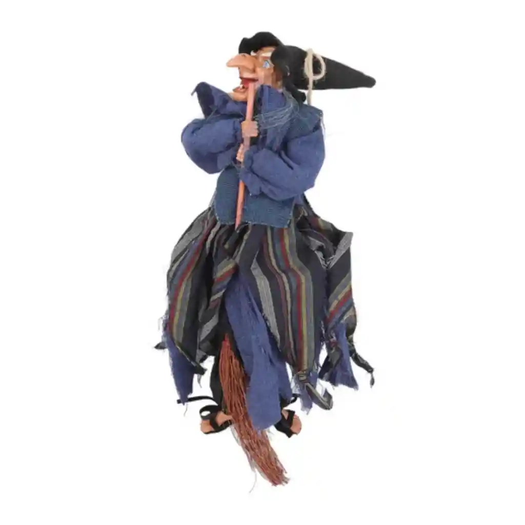 Bruja decorativa con escoba, luces brillantes y sonido aterrador. ¡Se ilumina y lanza gritos espeluznantes al activarse! Ideal para decorar en Halloween y asustar con estilo.