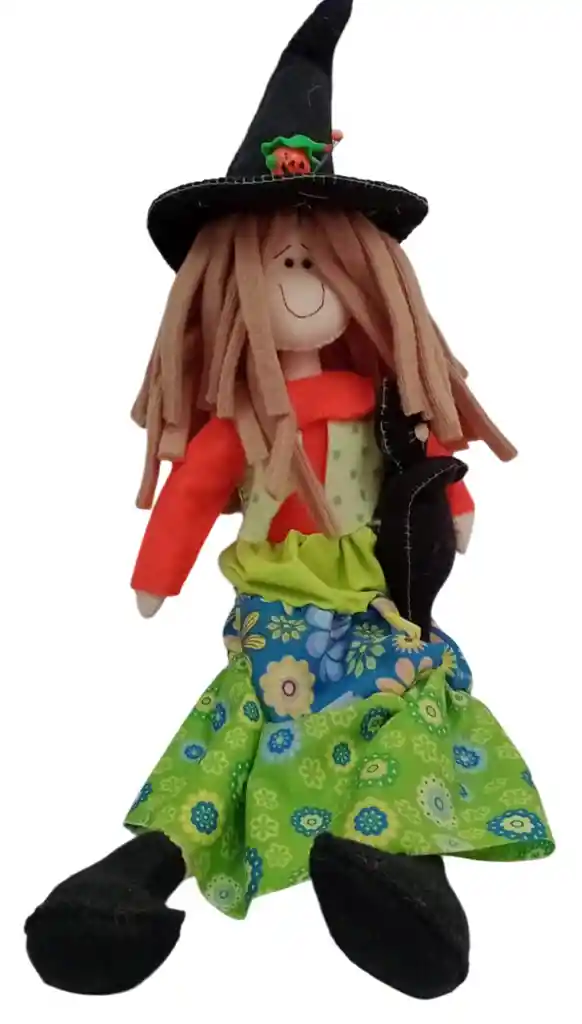 La encantadora Bruja Tosita con gato está hecha completamente a mano en tela, cuidando cada detalle para darle vida y personalidad. Con su sombrero puntiagudo, su vestido colorido y su pequeño gato compañero, transmite magia y ternura a la vez. Ideal para decorar espacios, regalar en temporada de Halloween o añadir un toque artesanal a tu colección. Cada pieza es única, elaborada con materiales suaves y de excelente calidad.