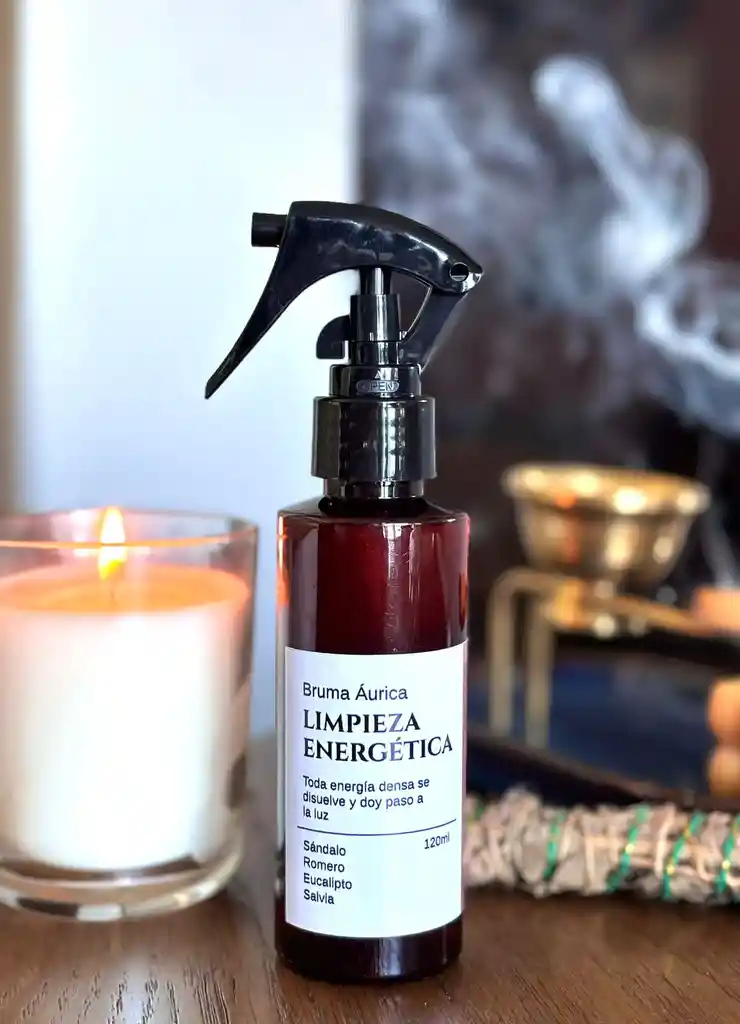 Bruma Áurica – Limpieza Energética Mezcla de aceites esenciales naturales, creada para rociar en tu espacio o en tu cuerpo. Ingredientes: Sándalo, Salvia, Romero, Eucalipto Toda energía densa se disuelve y doy paso a la luz.”