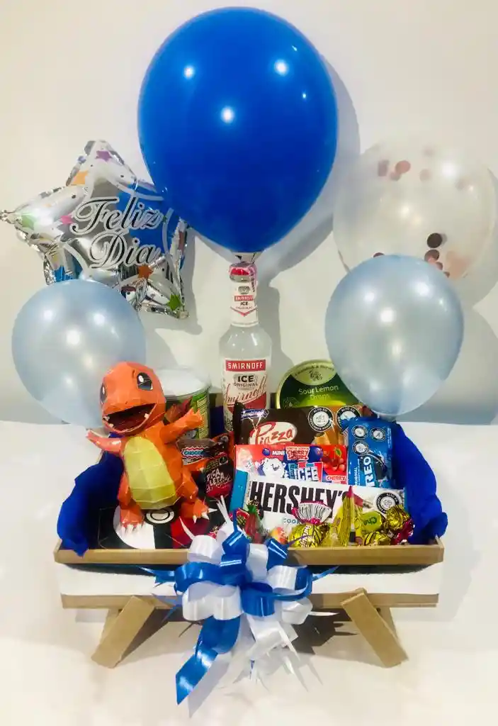 Contiene: 1 Pringles x 40 gr 1 Smirnoff Ice x 275ml 1 Dulces de limón Cavendish & Harvey 1 Piazza x 44 gr 1 Chocorramo Mini 2 Burbujas Jet 1 Dulce Ice Cereza 1 Galleta Oreo 1 Hersheys x 43 gr 2 Choco Stop 1 Dulces Jelly Beans 1 Dulces Cherry Sour 4 Rainbow mini 2 Oka Loka mini 4 Mentas Canels 1 Figura coleccionable de Charmander-arte de papel. Producto hecho a mano. Papel fotográfico brillante. Tamaño objeto: 13x16x17 cm (AnxAlxPr) 1 Bomba metalizada mediana feliz dia 2 Bomba R6 azul cromada 1 Bomba R9 azul oscuro 1 Bomba R12 transparente Caja en mdf de 30x30x5cm Se puede elegir el color de las bombas o el diseño, favor escribir por el chat y realizar el pedido con 30 minutos de antelación para peticiones especiales.