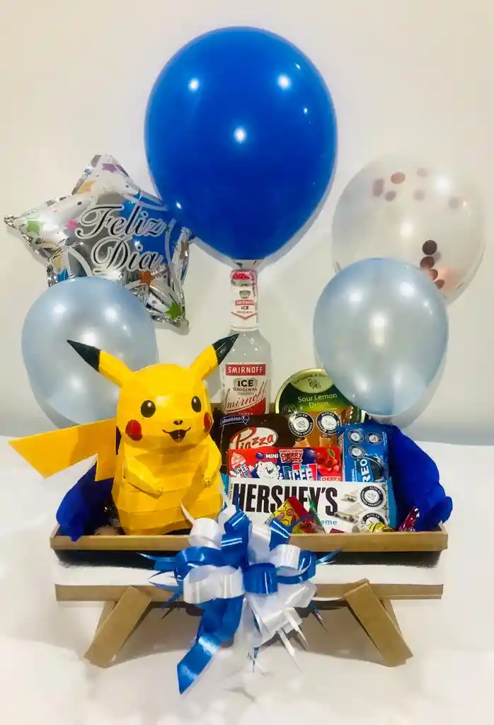 Contiene: 1 Pringles x 40 gr 1 Smirnoff Ice x 275ml 1 Dulces de limón Cavendish & Harvey 1 Piazza x 44 gr 1 Chocorramo Mini 2 Burbujas Jet 1 Dulce Ice Cereza 1 Galleta Oreo 1 Hersheys x 43 gr 2 Choco Stop 1 Dulces Jelly Beans 1 Dulces Cherry Sour 4 Rainbow mini 2 Oka Loka mini 4 Mentas Canels 1 Figura coleccionable de Pikachu-arte de papel. Producto hecho a mano. Papel fotográfico brillante. Tamaño objeto: 16x18x9 cm (AnxAlxPr) 1 Bomba metalizada mediana feliz dia 2 Bomba R6 azul cromada 1 Bomba R9 azul oscuro 1 Bomba R12 transparente Caja en mdf de 30x30x5cm Se puede elegir el color de las bombas o el diseño, favor escribir por el chat y realizar el pedido con 30 minutos de antelación para peticiones especiales.