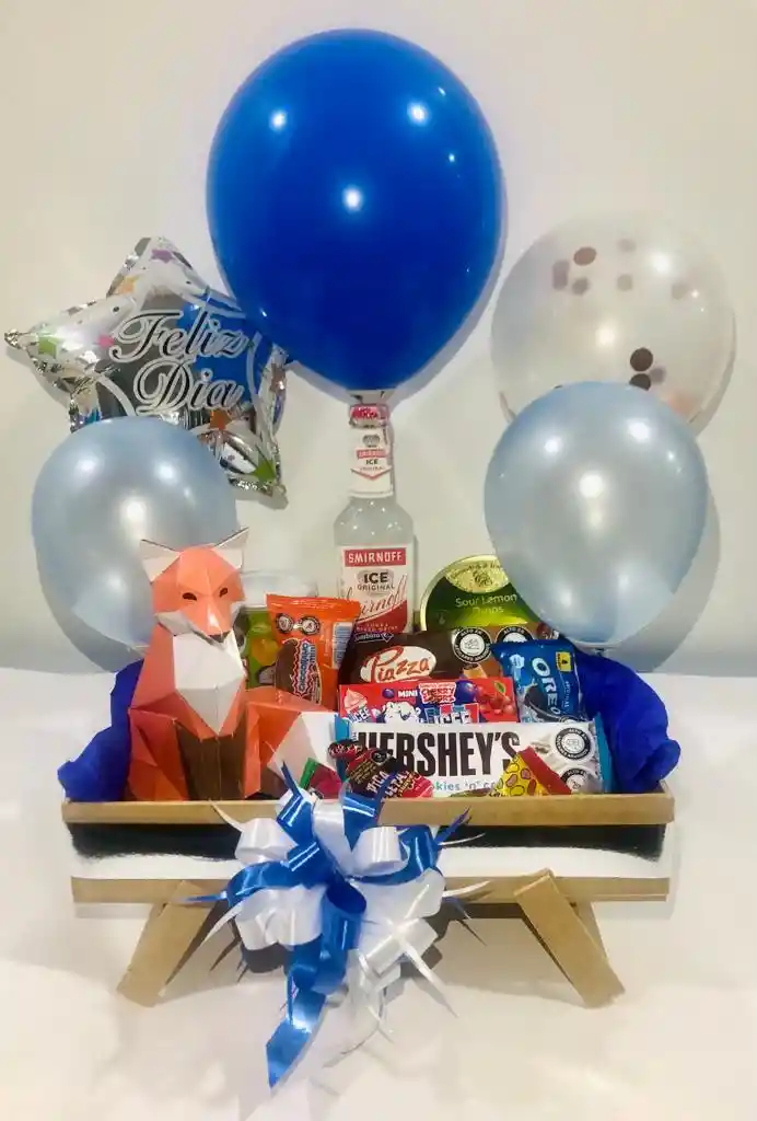 Contiene: 1 Pringles x 40 gr 1 Smirnoff Ice x 275ml 1 Dulces de limón Cavendish & Harvey 1 Piazza x 44 gr 1 Chocorramo Mini 2 Burbujas Jet 1 Dulce Ice Cereza 1 Galleta Oreo 1 Hersheys x 43 gr 2 Choco Stop 1 Dulces Jelly Beans 1 Dulces Cherry Sour 4 Rainbow mini 2 Oka Loka mini 4 Mentas Canels 1 Zorro decorativo con base en mdf. Arte de papel. Hecho a mano. Tamaño zorro: 13x16x12 cm (AnxAlxPr) 1 Bomba metalizada mediana feliz dia 2 Bomba R6 azul cromada 1 Bomba R9 azul oscuro 1 Bomba R12 transparente Caja en mdf de 30x30x5cm Se puede elegir el color de las bombas o el diseño, favor escribir por el chat y realizar el pedido con 30 minutos de antelación para peticiones especiales.