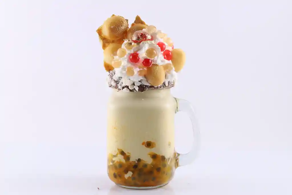 Malteada acompañada de chantilly, nutella, merengue, maracuya, explosiones, bubble waffle y cereza.