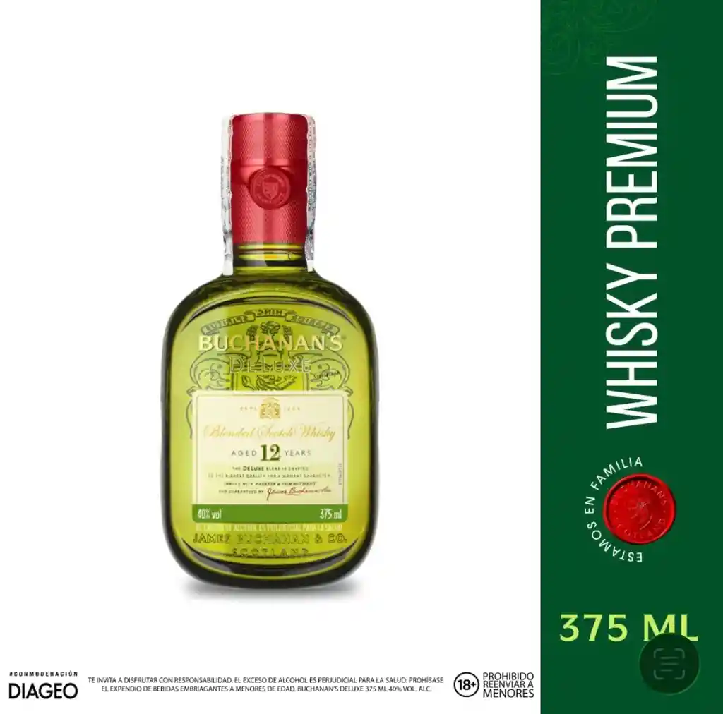 Buchanans Deluxe 12 Años es un emblemático blended scotch whisky escocés, reconocido por su suavidad, equilibrio y perfil de sabor afrutado con notas de naranja y chocolate. Añejado por un mínimo de 12 años en barricas de roble, ofrece un carácter dulce y ligero (40% alc. vol.), ideal para tomar en las rocas o con soda.