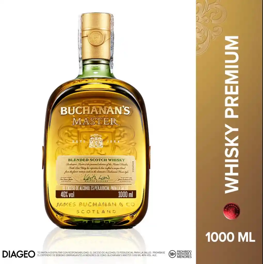 Buchanan's Master es un whisky escocés tipo blended de lujo, reconocido por su suavidad y equilibrio, seleccionado por el maestro mezclador Keith Law. Ofrece un perfil rico con notas dulces de miel, chocolate y toques cítricos de naranja, combinados con un carácter fresco y ligeramente ahumado. Ideal para tomar en las rocas. Exito.com