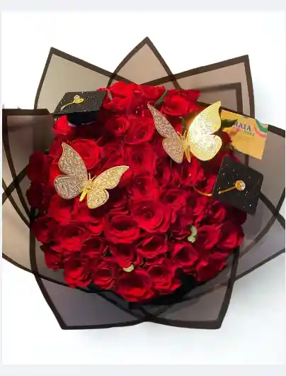 Buchon con aprox. 50 rosas rojas y mariposas. Nota: La flor puede ser sustituida dependiendo la disponibilidad de color y del producto “Mensaje Personalizado” máximo de 30 caracteres (Dejar el mensaje en el chat, los comentarios no se previsualizan para la tienda por lo que si se dejan allí no podrá ser incluido).