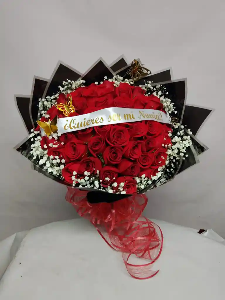 buchón de 50 rosas mas cinta personaliza y follaje