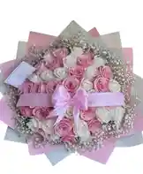 Ramo buchón de rosas rosadas y blancas Un lujoso ramo compuesto por una mezcla de 24 rosas rosadas y blancas, perfecto para expresar ternura y elegancia en cualquier ocasión especial. Nota: La flor puede ser sustituida dependiendo de la disponibilidad de color y del producto. "Mensaje Personalizado" máximo de 30 caracteres (Dejar el mensaje en el chat, los comentarios no se previsualizan para la tienda, por lo que si se dejan allí no podrá ser incluido).