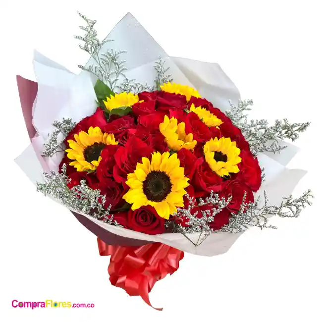 Hermoso bouquet de 7 girasoles y 80 rosas con finos follajes, incluye tarjeta con mensaje personalizado.