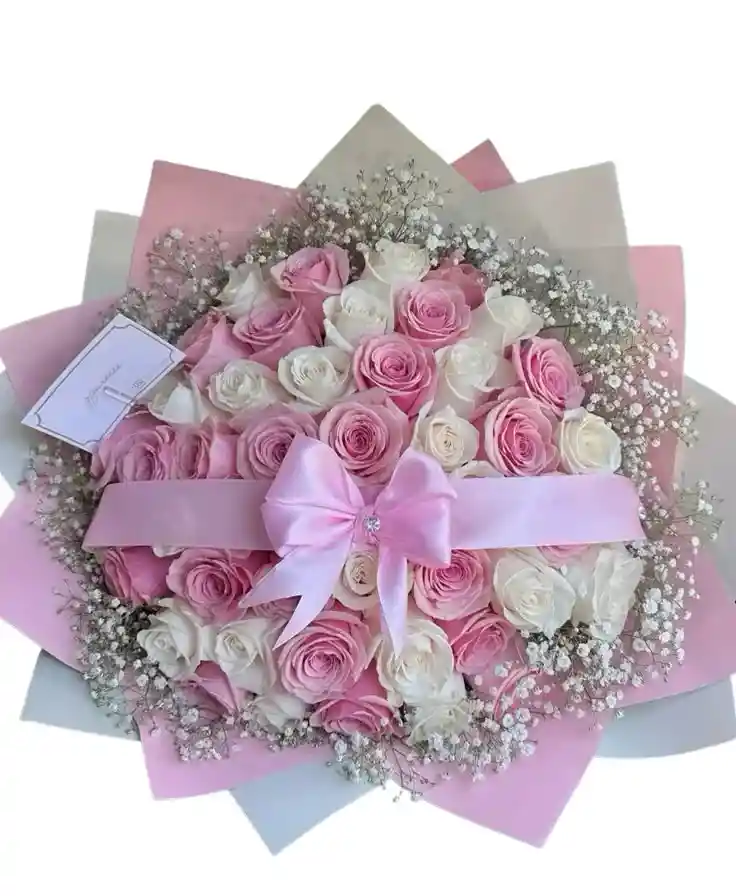 Ramo buchón de rosas rosadas y blancas Un lujoso ramo compuesto por una mezcla de 24 rosas rosadas y blancas, perfecto para expresar ternura y elegancia en cualquier ocasión especial. Nota: La flor puede ser sustituida dependiendo de la disponibilidad de color y del producto. "Mensaje Personalizado" máximo de 30 caracteres (Dejar el mensaje en el chat, los comentarios no se previsualizan para la tienda, por lo que si se dejan allí no podrá ser incluido).
