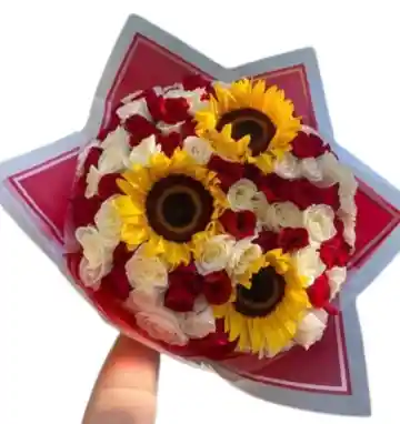 ramo de 3 girasoles con 24 rosas rojas y blancas La flor puede ser sustituida dependiendo la disponibilidad de color y del producto “Mensaje Personalizado” máximo de 30 caracteres (Dejar el mensaje en el chat, los comentarios no se previsualizan para la tienda por lo que si se dejan allí no podrá ser incluido)