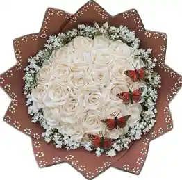 Buchon con aprox 40 rosas blancas, gypsophila y 4 mariposas. Nota: La flor puede ser sustituida dependiendo la disponibilidad de color y del producto “Mensaje Personalizado” máximo de 30 caracteres (Dejar el mensaje en el chat, los comentarios no se previsualizan para la tienda por lo que si se dejan allí no podrá ser incluido).