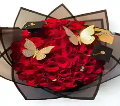 Buchon con aprox. 50 rosas rojas y mariposas. Nota: La flor puede ser sustituida dependiendo la disponibilidad de color y del producto “Mensaje Personalizado” máximo de 30 caracteres (Dejar el mensaje en el chat, los comentarios no se previsualizan para la tienda por lo que si se dejan allí no podrá ser incluido).