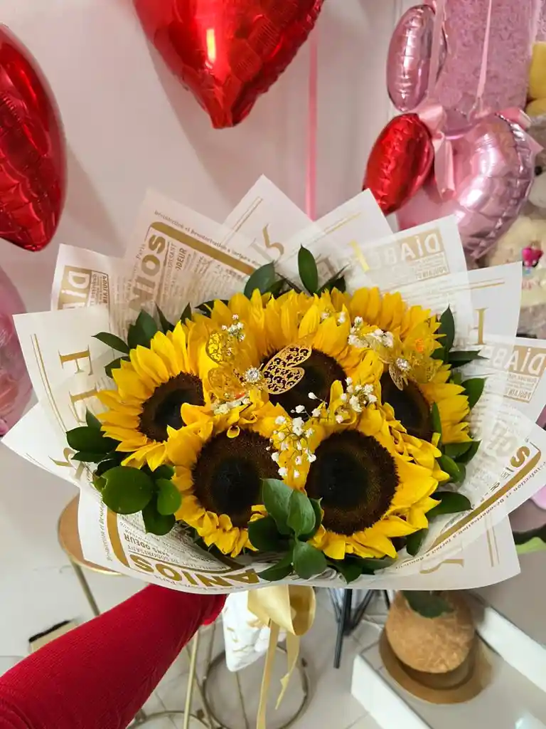 Buchón de 7 girasoles grandes con follaje misto , envoltura especial en papel coreano, mariposas decorativas y tarjeta personalizada. *Color de papel coreano según disponibilidad*