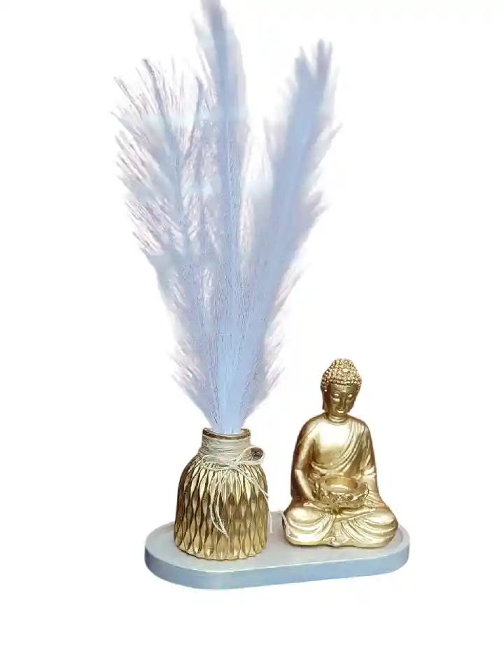 hermoso buda dorado con matera y plumones trae una base en cerámica terminada en resina