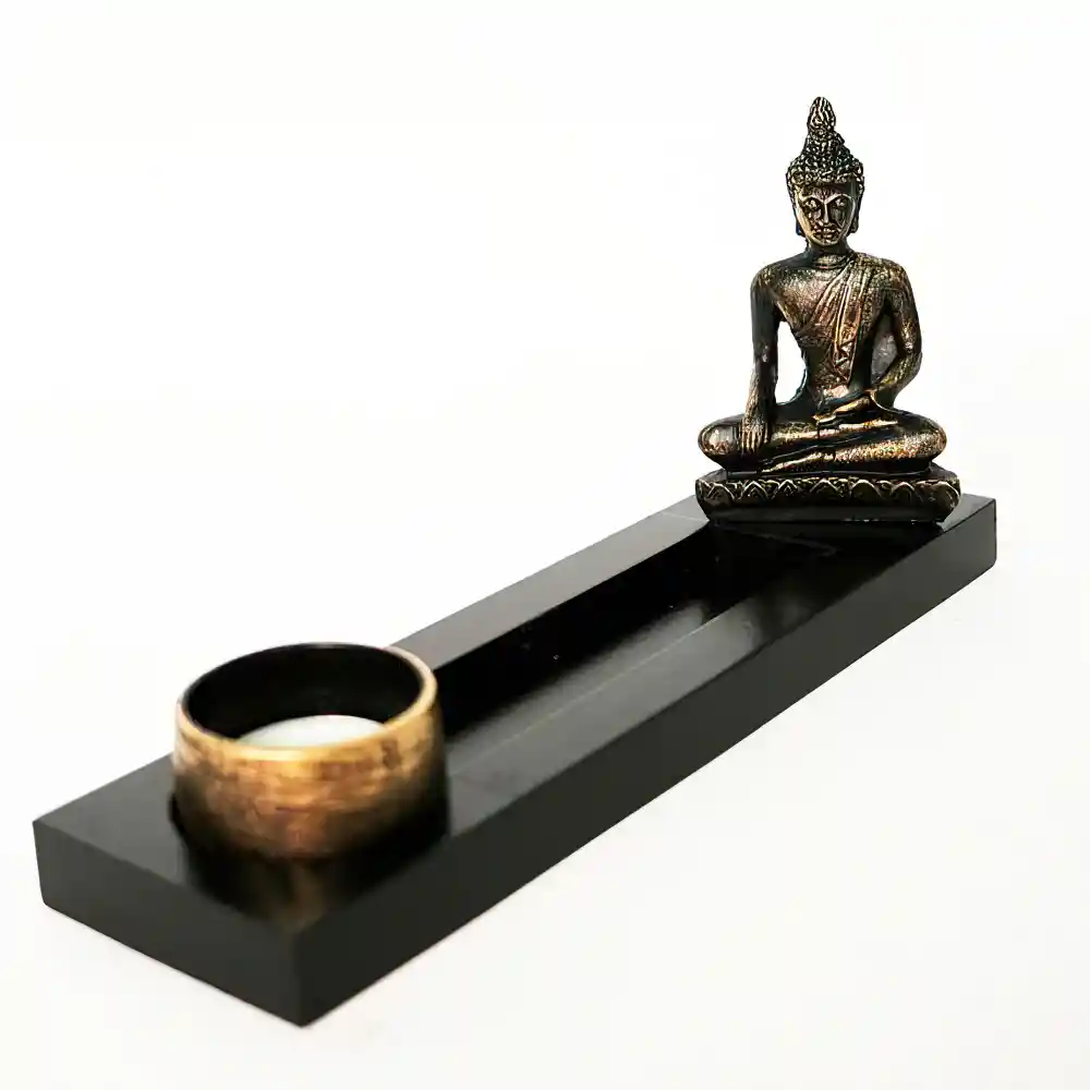 Este exclusivo Porta incienso esta representado por la figura de buda sentado, Siendo un símbolo inspirador de vitalidad, nobleza y autosuperación. Decora tu espacio favorito con este delicado artículo que traerá la sabiduría, armonía, serenidad a tú hogar. ///incluye base de madera, tres varitas de incienso, figura de buda sentado en poliresina y un porta vela con su vela respectivamente.//// Ficha Técnica: Dimensiones Figura: (Alto x Ancho x Largo): 10 cm x 6 cm x 4 cm Material de la figura: Poli resina Dimensiones Porta vela: (Alto x Ancho x Largo): 2.5 cm x 4.5 cm x 4.5 cm Material: Poli resina Dimensiones de la base: (Alto x Ancho x Largo): 1.5 cm x 7 cm x 24 cm Material: Madera Longitud de las varitas de incienso : 15 cm _Para defectos de fábrica o retractos: _Por favor revise el producto apenas lo reciba y antes de usarlo. No aplican ley de retracto o defectos de fábrica luego de usar el producto. Se manejan máximo 5 días para reportar defectos de fábrica (por ejemplo, producto funciona mal, piezas faltantes, rotas, etc). Para hacer efectiva la devolución el producto debe devolverse con el empaque original, el cual debe estar en buen estado, incluir todos los documentos y las partes completas y sin daños. Los cuidados y recomendaciones para mantener un producto en buen estado son los siguientes: No aplicarle perfumes ni cremas directamente, no mojarlos, no dejarlos caer y procurar limpiarlos para retirar suciedad. Precauciones: No dejar nunca una vela encendida sin vigilancia, y mantener fuera del alcance de los niños.