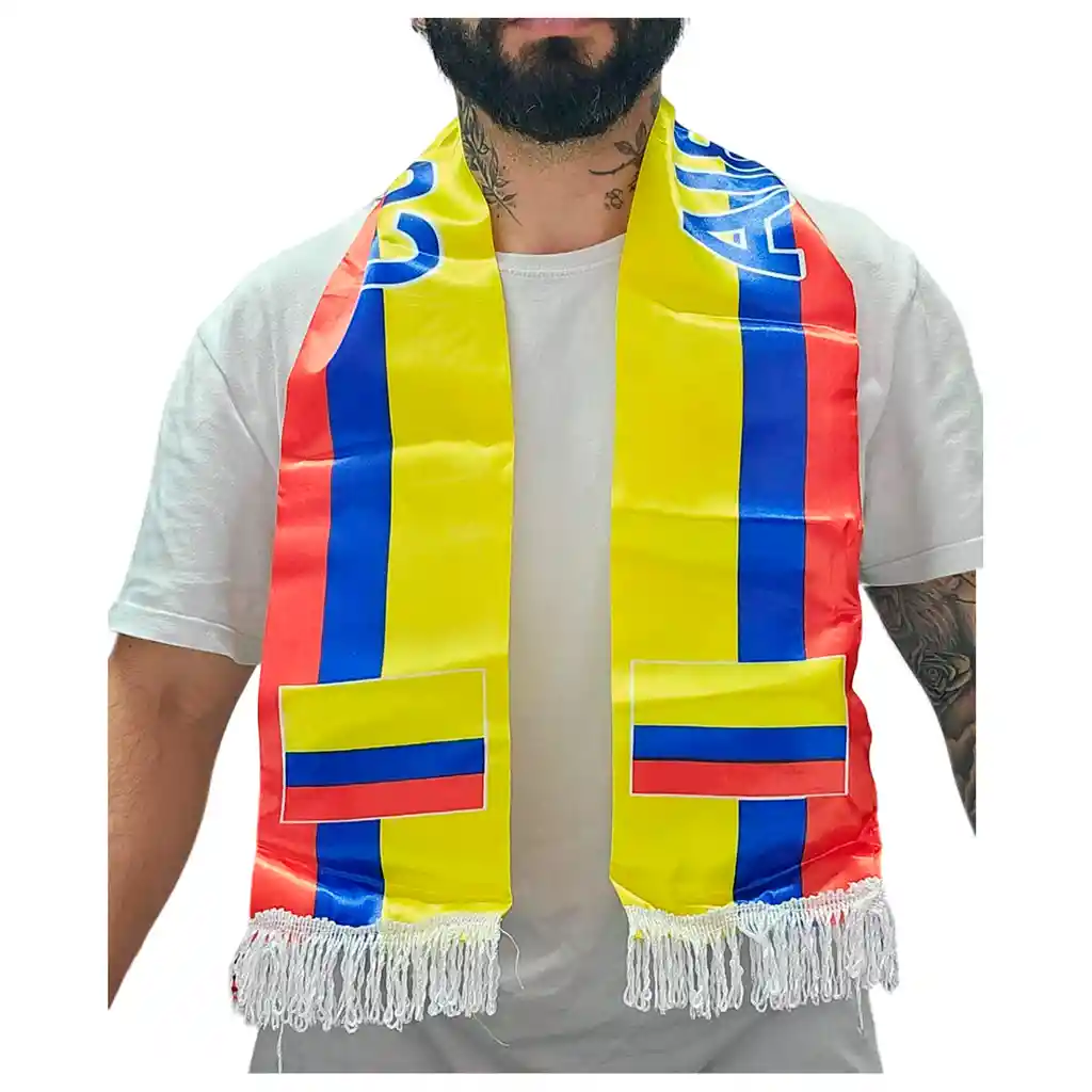 Bufanda de Colombia Perfecta para transmitir ese Orgullo Nacional. 100% Fibras Sinteticas de Poliester. Medidas: 137 cm x 14 cm. Colores vivos, hilo acrílico de alta calidad, muy suave al tacto. Cuenta con la inscripción "Colombia", Imprescindible para cualquier fan del Deporte Colombiano y un gran recuerdo para cualquier persona.