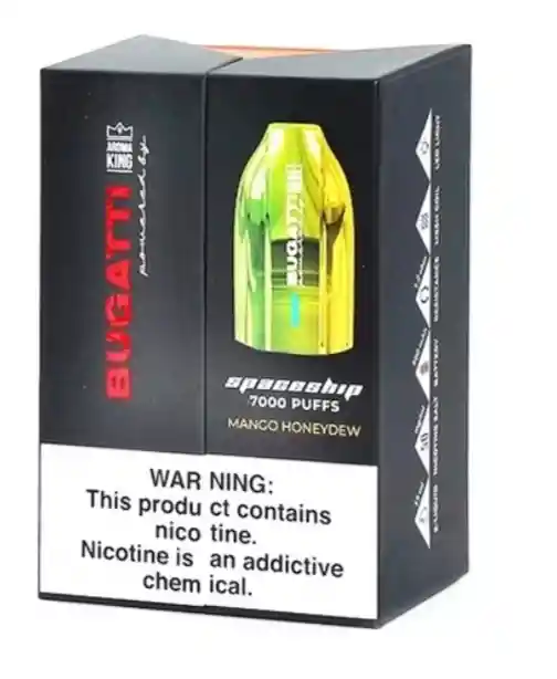 Sabor: Dulce y jugoso mango. Evocando el diseño del súper auto más famoso, el Bugatti Spaceship de Aroma King esta equipado con la más moderna tecnología y 7000 hits para un vapeo extraordinario.