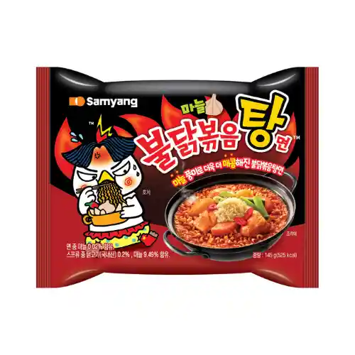 Ramen coreano ultra picante con intenso sabor a pollo y un delicioso toque de ajo . Su caldo espeso y especiado combina perfectamente con fideos suaves y el característico picante de la línea Buldak. Ideal para los amantes del ramen fuerte y lleno de sabor.