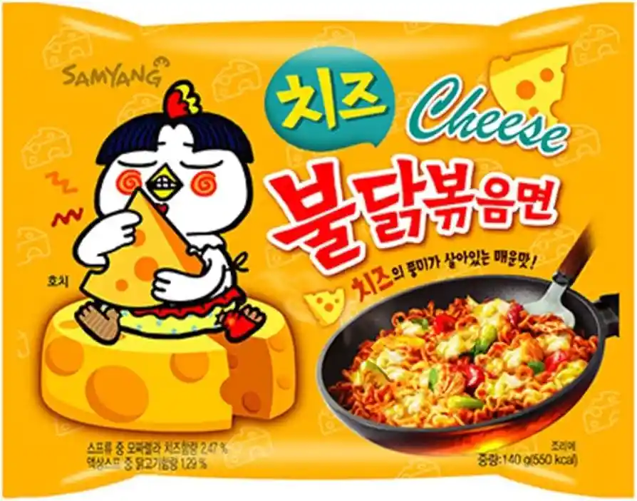 ofrece una experiencia de sabor intensamente picante, equilibrada por el cremoso toque del queso. Los fideos son gruesos y tienen una mordida satisfactoria, mientras que la mezcla de especias y el queso crean una combinación única de sabores y texturas.
