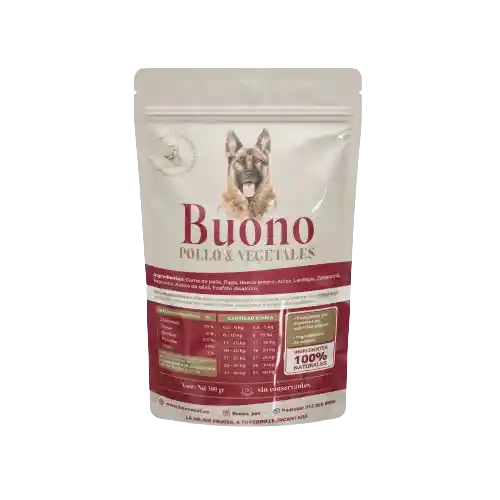 Buono es un alimento horneado totalmente natural. Viene en presentación de 500 gr. nuestro principal ingrediente es la proteína animal. Tenemos dos sabores pollo y carne de res. Los ingredientes son: Pollo o carne de res según el sabor y papa huevo arroz lenteja zanahoria espinaca y aceite de oliva