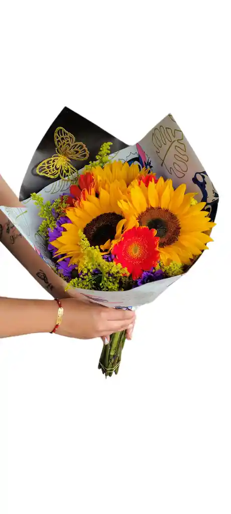 arreglo de flores, gerveras, margarita, girasoles, mariposa, moño, papel coreano ( varia dependiendo de la disponibilidad)