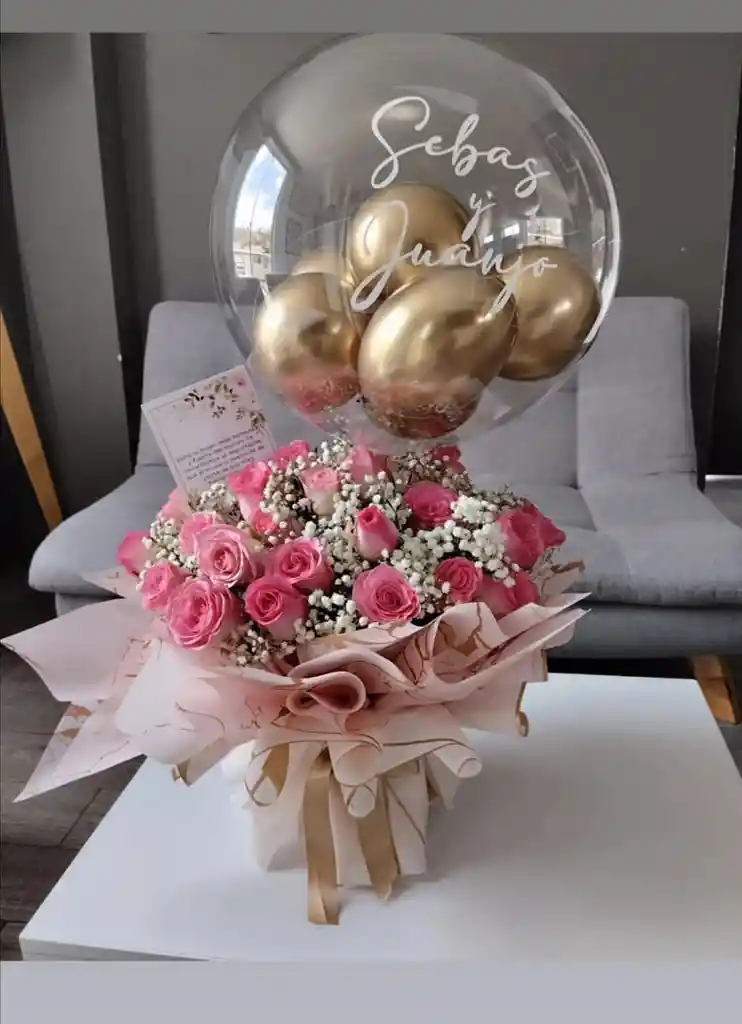 hermoso buque, con rosas rosa y con un globo en helio con 5 globos por dentro del color que desees