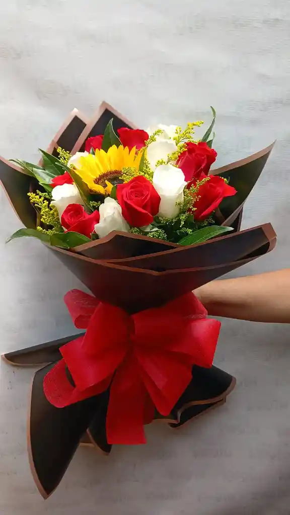 BUQUET GIRASOL, ROSAS BLANCAS Y ROJAS, PAPEL COREANO, MOÑO TELA MICROFIBRA.