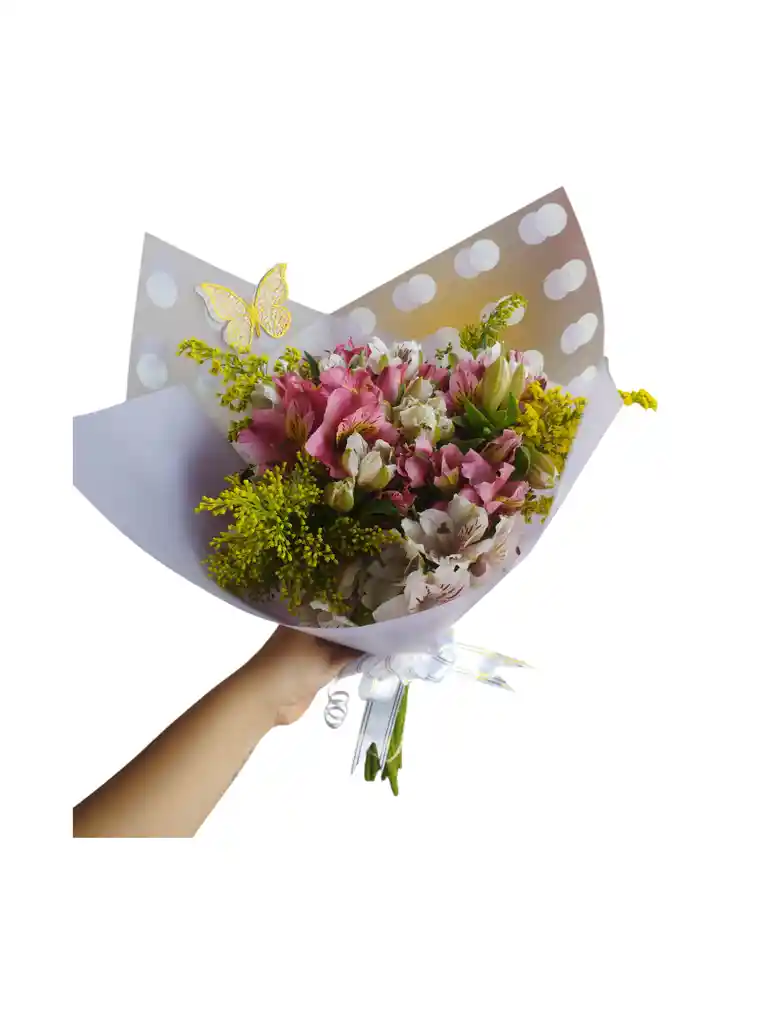 buquet de astromelias con dos colores,aster, moño, mariposa y papel coreano (varia dependiendo de la disponibilidad )