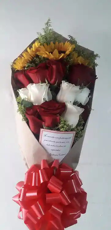 3 girasoles, 12 rosas, follaje, papel craft, moño., tarjeta.
