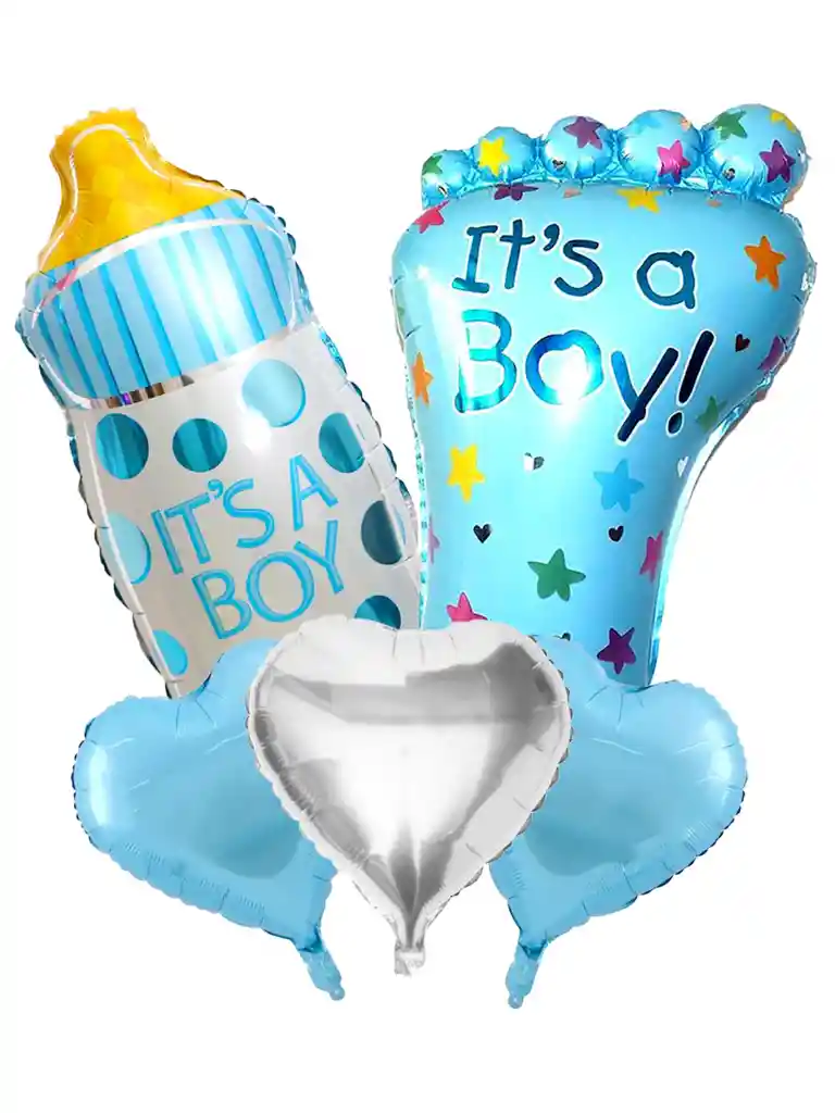 Kit de globos Baby Shower niño * 5 unidades 2 Globos grandes biberon y pie its a boy 2 Globos en forma de corazon azul 18" 1 globo en forma de corazon plata 18" disponibilidad inmediata