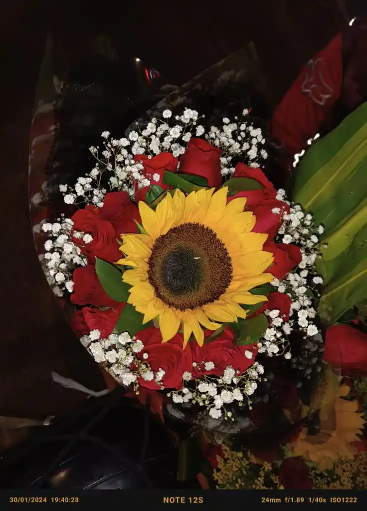 BUQUET PEQUEÑO DE ROSAS CON GIRASOL EN MEDIO