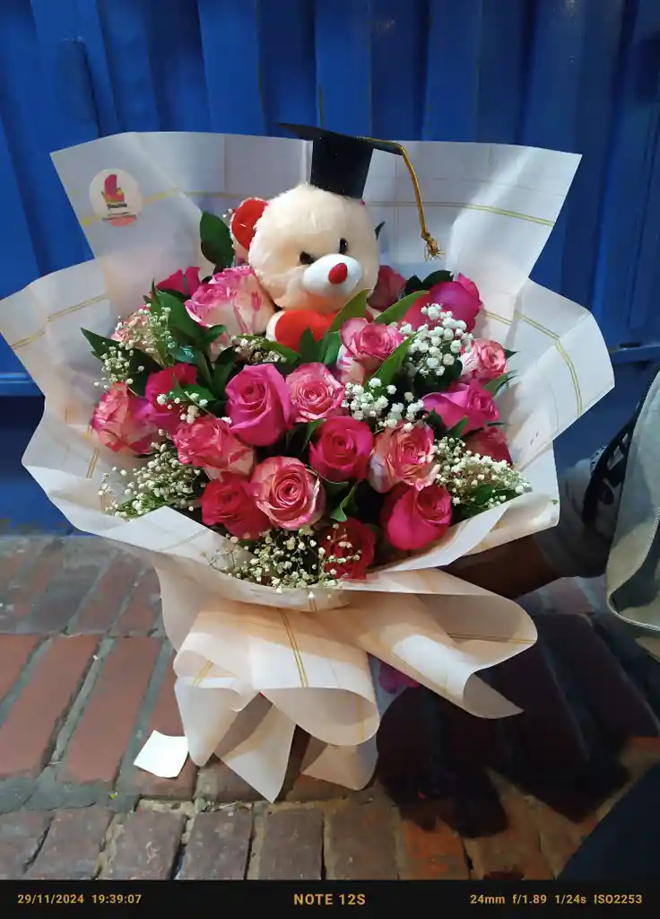 BUQUET EN ROSAS CON PELUCHE Y GORRO DE GRADO, DECORADO EN PAPEL ESPECIAL