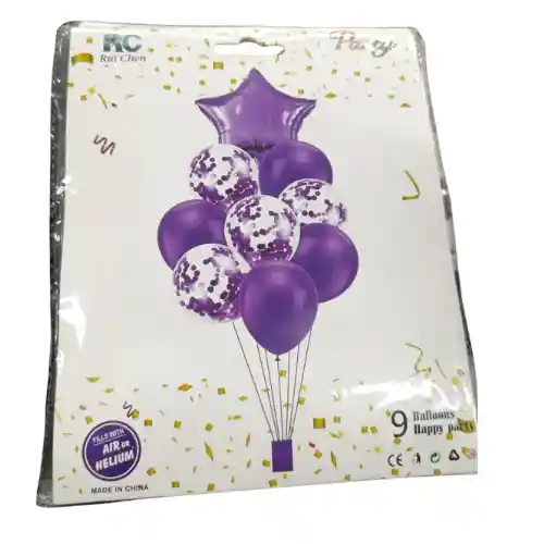 Buquet de 9 globos: 1 globo ESTRELLA 4 globos cristal con confeti 4 globos morado R12 QUEDAN 2 UNIDADES DISPONIBLE Buquet de 10 globos: 1 globo ESTRELLA 2 globos Corazon 3 globos cristal con confeti 4 globos morado R12 QUEDAN 1 UNIDADES DISPONIBLE