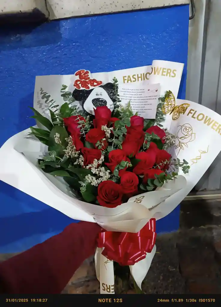 BUQUET EN ROSAS ROJAS CON EUCALIPTA, CHOCOLATES FERRERO Y PIN