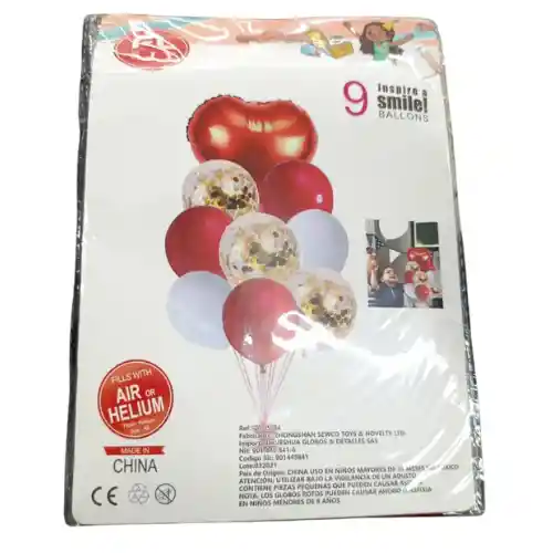 Buquet de 9 globos: 1 globo corazón 3 globos cristal con confeti 3 globos rojos R12 2 globos blancos R-12 QUEDAN 3 UNIDADES DISPONIBLE