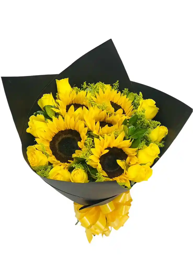 Arreglo floral x12 rosas tipo exportación en tonalidad amarillo + 5 girasoles Follaje fino brillantina, solidago Moño en satín amarillo Papel cartulina negro