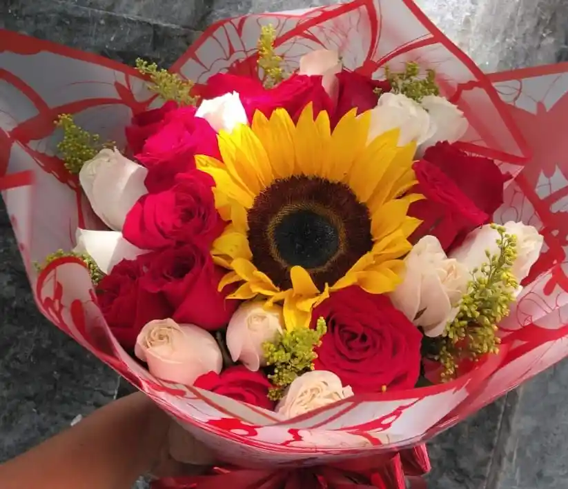 1 girasol y 12 rosas blancas y rojas