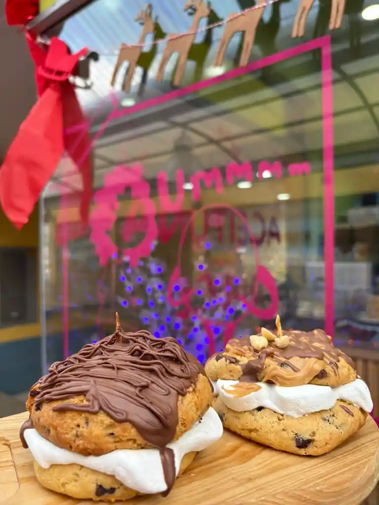 masa de galleta chips con relleno de masmelo, con capa de chocolate y mantequilla de mani