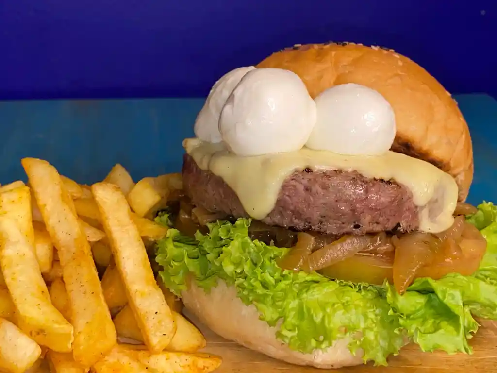 Pan parmesano, 150 gr de carne de la casa, burrata, queso mozzarella, rúcula, tomate y cebolla caramelizada. Acompañada de papas a la francesa Salsas a tu gusto