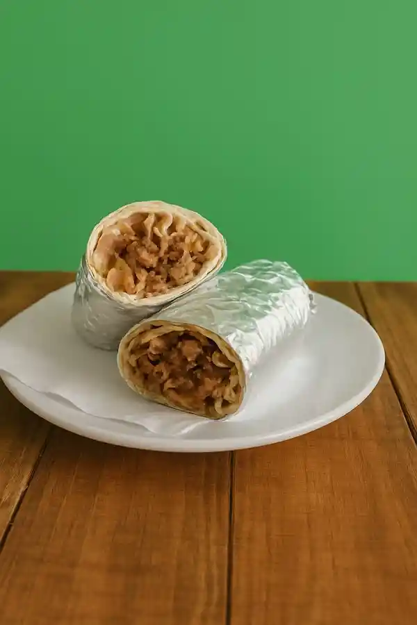 Burritos con tortilla, carne desmechada, tomate, cebolla morada, tomate, cilantro y queso doble crema.