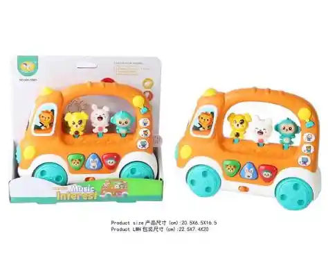 Descripción General¡Despierta el interés musical y la curiosidad de tu bebé con este adorable Bus Musical Interactivo! Este juguete de arrastre/empuje está diseñado para el desarrollo sensorial y la motricidad fina en las primeras etapas.El bus cuenta con tres figuras de animales (mono, conejo y un animal amarillo similar a un oso/perro) que suben y bajan, además de botones con forma de animales que activan diferentes sonidos, melodías y luces, haciendo del aprendizaje una aventura divertida.Características PrincipalesInterés Musical: El juguete se centra en el desarrollo del "Music Interest" (Interés Musical).Múltiples Modos de Juego: Incluye 2 modos de sonido (música y modo de aprendizaje) y 3 modos de sonido animal.Figuras Interactivas: Tres pequeñas figuras de animales se encuentran en la parte superior y se mueven o reaccionan al presionar la bocina o los botones (típico de estos juguetes).Botones de Animales: En la parte inferior, hay botones con forma de animales (mono, conejo, perro/oso) que activan diferentes sonidos.Diseño Atractivo: Colores brillantes (naranja, azul, verde, rojo) y un diseño redondeado y seguro para bebés.Especificaciones TécnicasCaracterísticaDetalleTipo de ProductoJuguete Musical y de Estimulación TempranaMedidas del ProductoLargo: 20.5 cm Alto: 16.5 cmMedidas del EmpaqueLargo: 22.5 cm Alto: 20 cmFunciones de Sonido2 Modos de Sonido, 3 Modos de Sonido AnimalEdad RecomendadaNo especificada, pero adecuado para la etapa de gateo y preescolar.AlimentaciónRequiere baterías