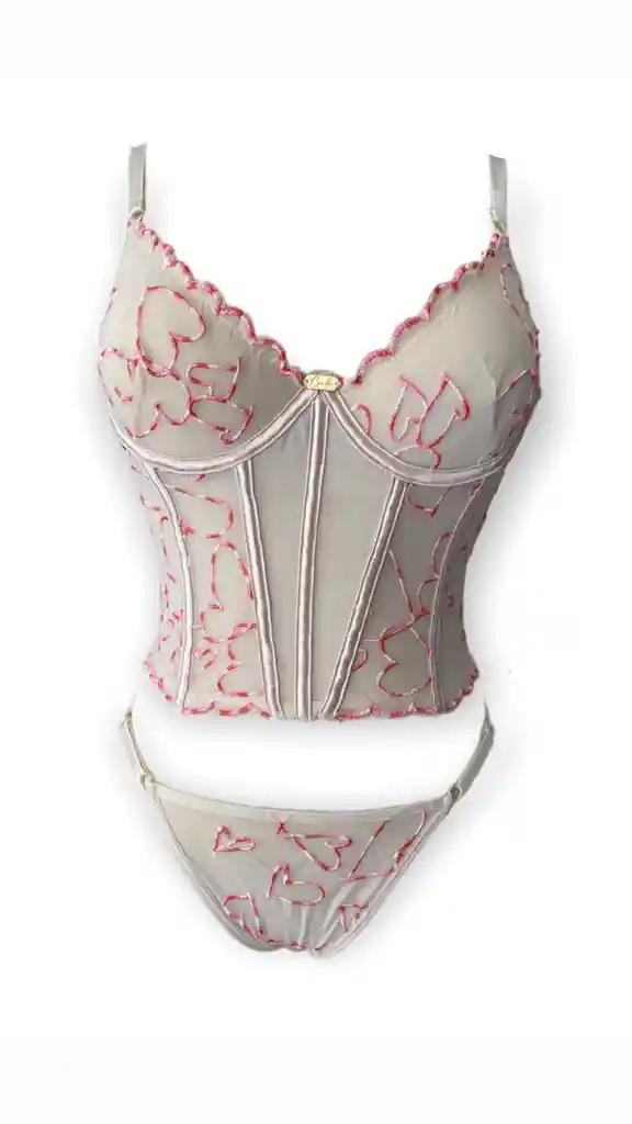 Un hermoso Bustier en set con panty en hilo ajustable. Nuestro exclusivo tul bordado y una mezcla de detalles. Disponible talla S M L XL