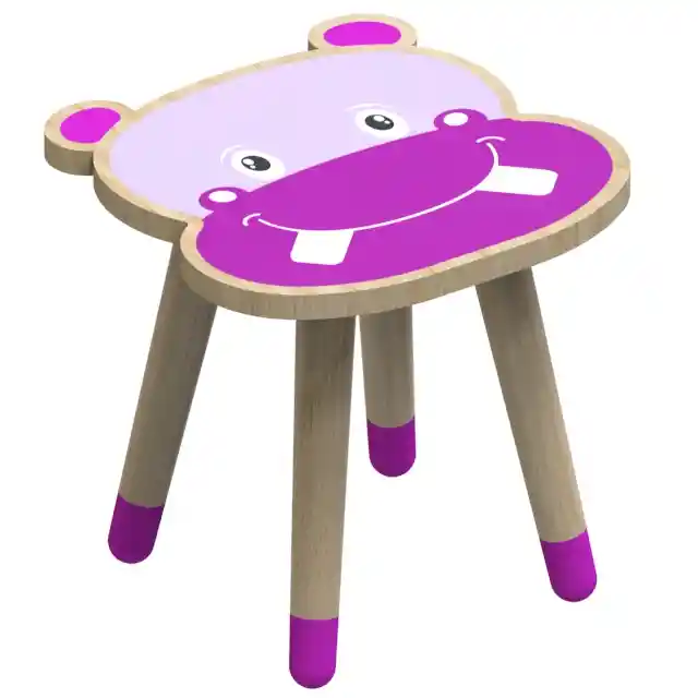 Butaco en madera de pino, con diseño decorativo del rostro de un hipopótamo en el asiento, para niños y adultos. Con cuatro patas cónicas y ensamble con platinas en la parte inferior del asiento, resistente al peso. Diámetro: 30cm Altura: 30cm