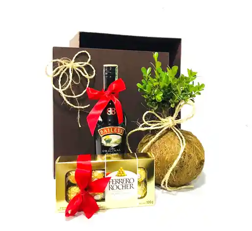 Bonsai Buxus Kokedama con Baileys x 375ml, caja de Ferrero Rocher Champagne y caja pasta dura reutilizable.