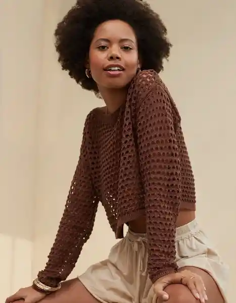 Mezcla de Algodón Manga Larga Cuello Redondo Diseño de Tejido Abierto Suéter Tejido.