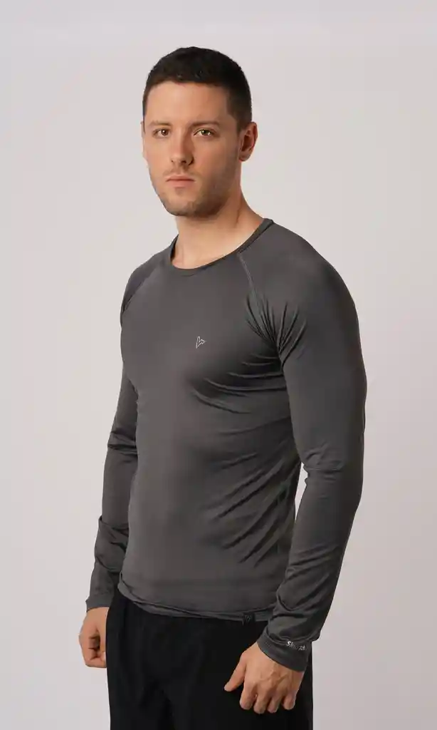 Camiseta deportiva con protección solar UVP 50+ Composición: 88% Poliéster 12% Spandex Textura suave tacto y liviana Skintech: regulación de temperatura, control de humedad, proceso antimicrobiano Fit / Horma: Compresión Material y Lavado: a mano, lavadora a temperatura ambiente/fría, no retorcer, no planchar, no utilizar suavizantes Hecho en Colombia Diseñado para correr, entrenar, protegerse del sol