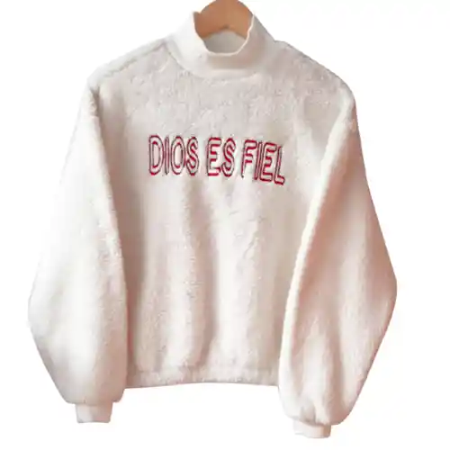 Buzo Dios es fiel para Mujer color beige y materal de peluche con bordado